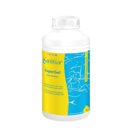 Saniklar SuperGel är ett effektivt medel för borttagning av envisa beläggningar och smutskanter omkring swimmingpoolens vattenlinje.