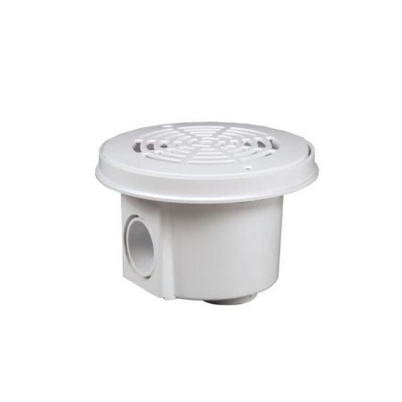 Bottenutlopp Ø210 mm för betong pool med liner, tillverkad i vit ABS-plast. Levereras komplett med vitt galler, packningar och skruvar i rostfritt stål. Vågrät 2" anslutning för avloppsrör. Max flöde på 13 m³